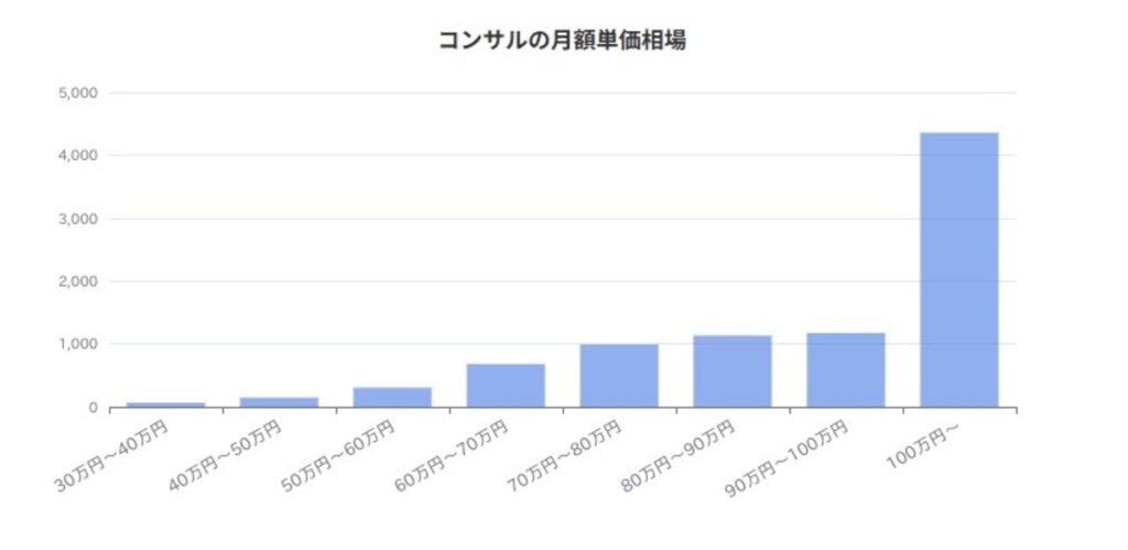 フリーランスコンサルタントは種類やレベルによって違いはあるものの、月単価が100万以上の案件は珍しくありません。フリーランスエージェントであるフリーランスHubが公開している月額単価相場では、月100万円以上の案件が最も多いとされています